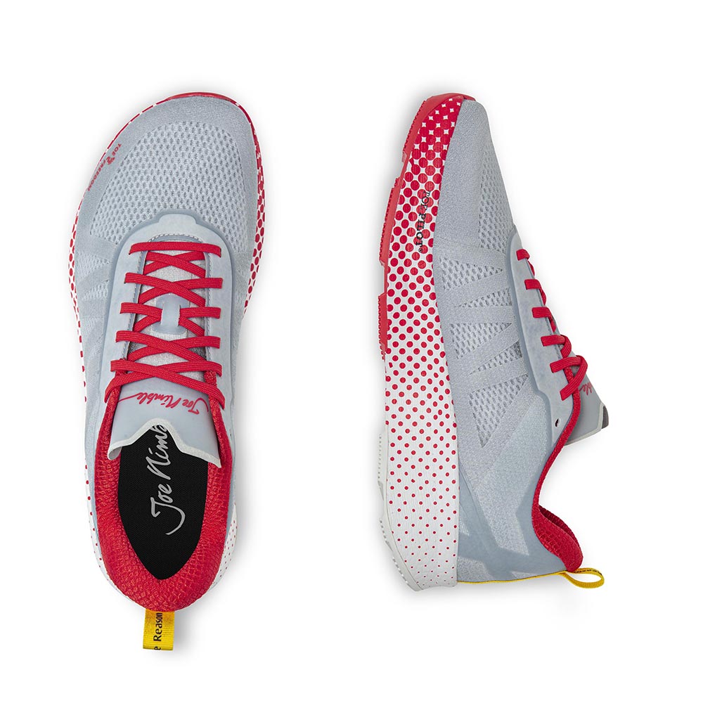 Closeup des Joe Nimble Addict Pro-R Laufschuh in grau-rot und mit Läufer in Aktion